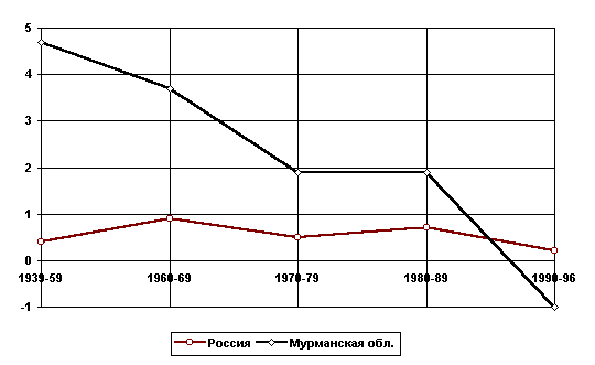 Мурманской области и Российской Федерации за 1939-1996 гг.